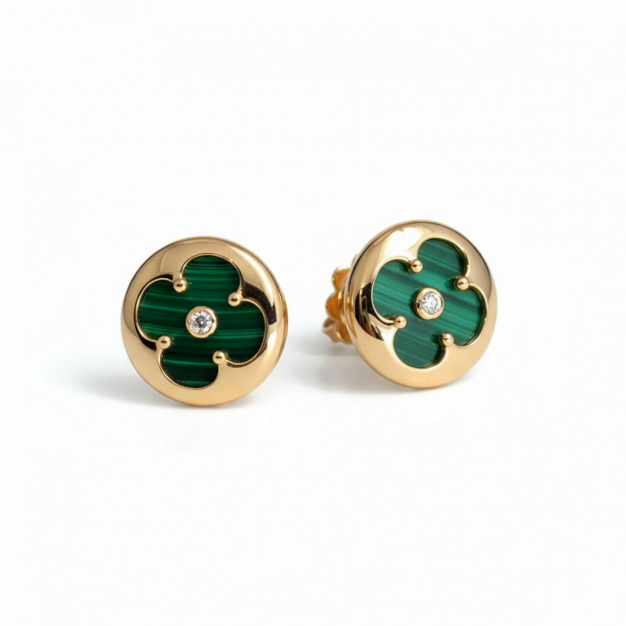 DZELTENĀ ZELTA 750 PROVES AUSKARI AR BRILJANTIEM UN MALAHĪTA AKMENI "HAPPY CLOVERLEAF"